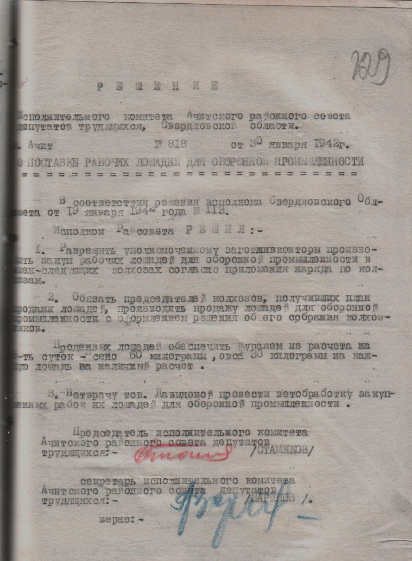 Решение Исполнительного комитета Ачитского районного Совета депутатов трудящихся Свердловской области от 30 января 1942 года № 818 «О поставке рабочих лошадей для оборонной промышленности».
