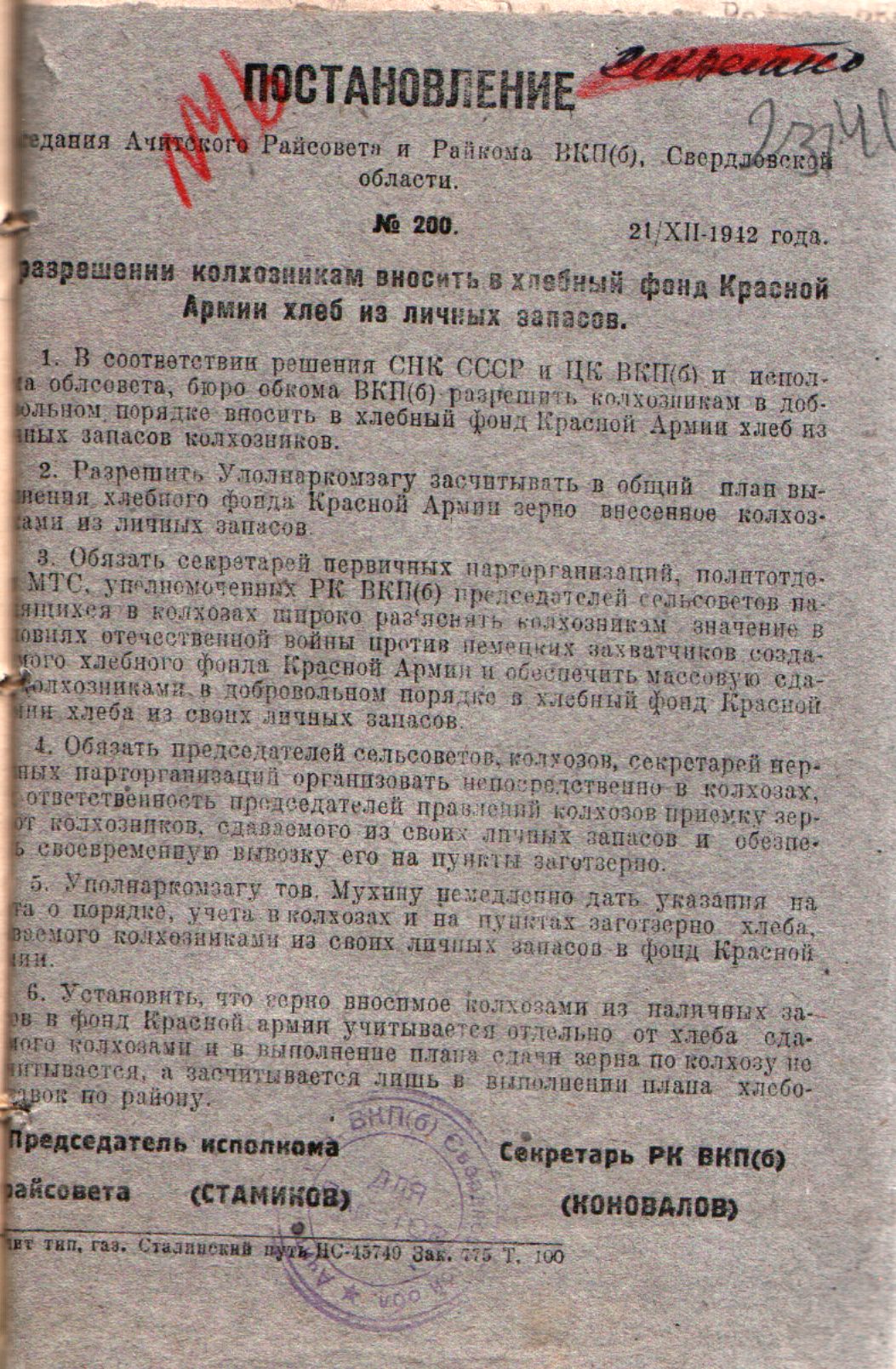 Постановление Ачитского Райсовета и Райкома ВКП(б) Свердловской области от 21 декабря 1942 года № 200 «О разрешении колхозникам вносить в хлебный фонд Красной Армии хлеб из личных запасов».