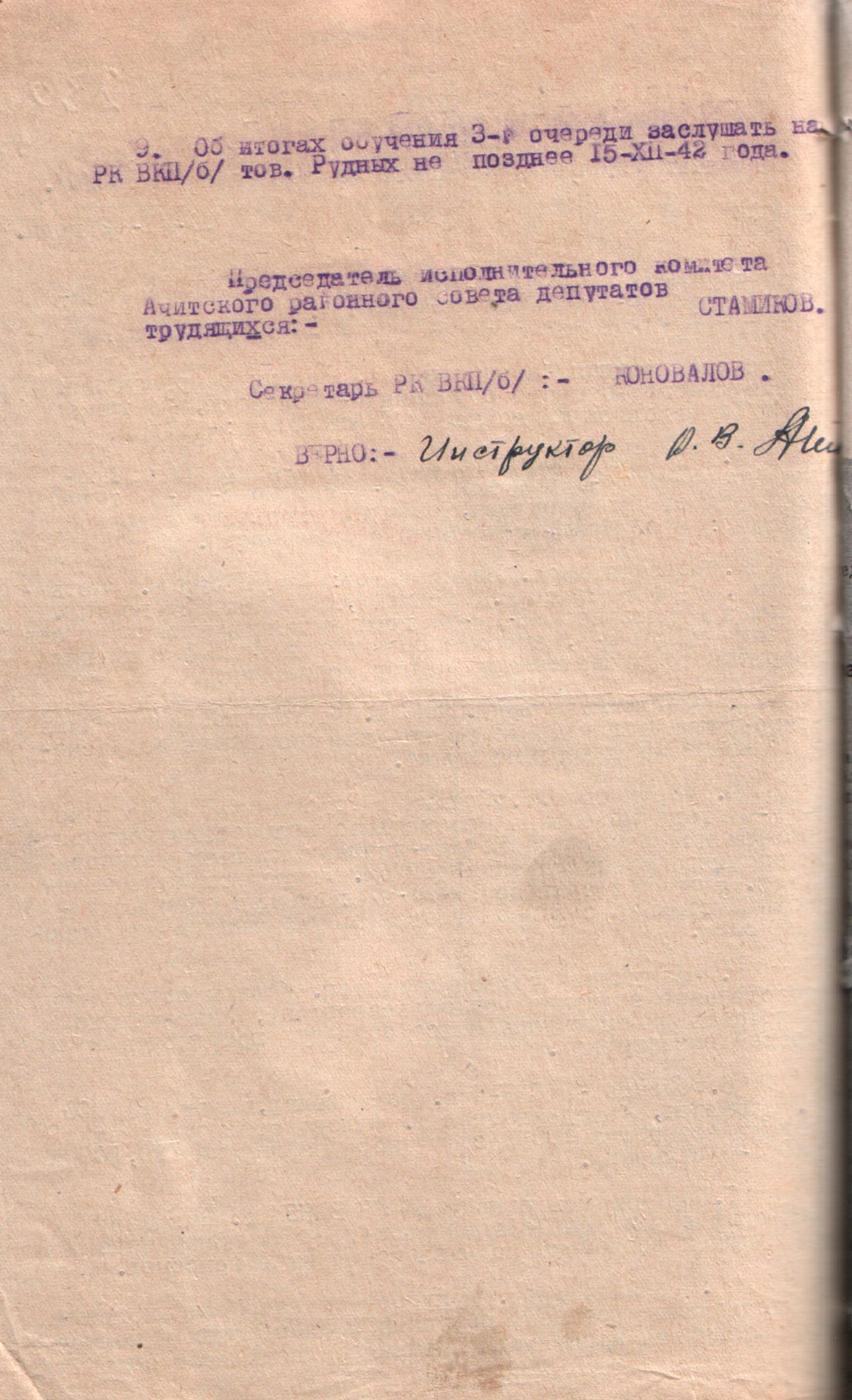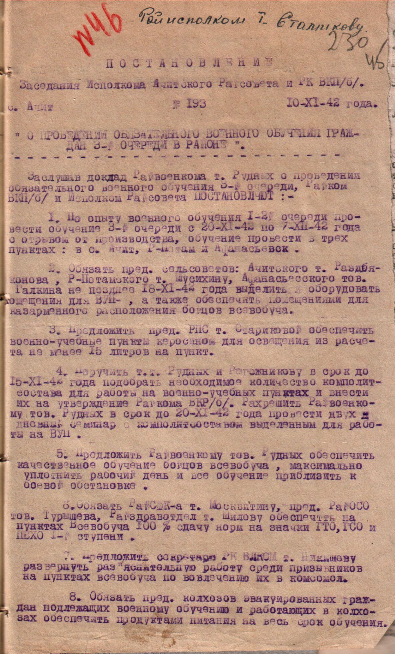 Постановление Исполнительного комитета Ачитского районного Совета депутатов трудящихся Свердловской области от 10 ноября 1942 года «О проведении обязательного военного обучения граждан 3-й очереди в районе».