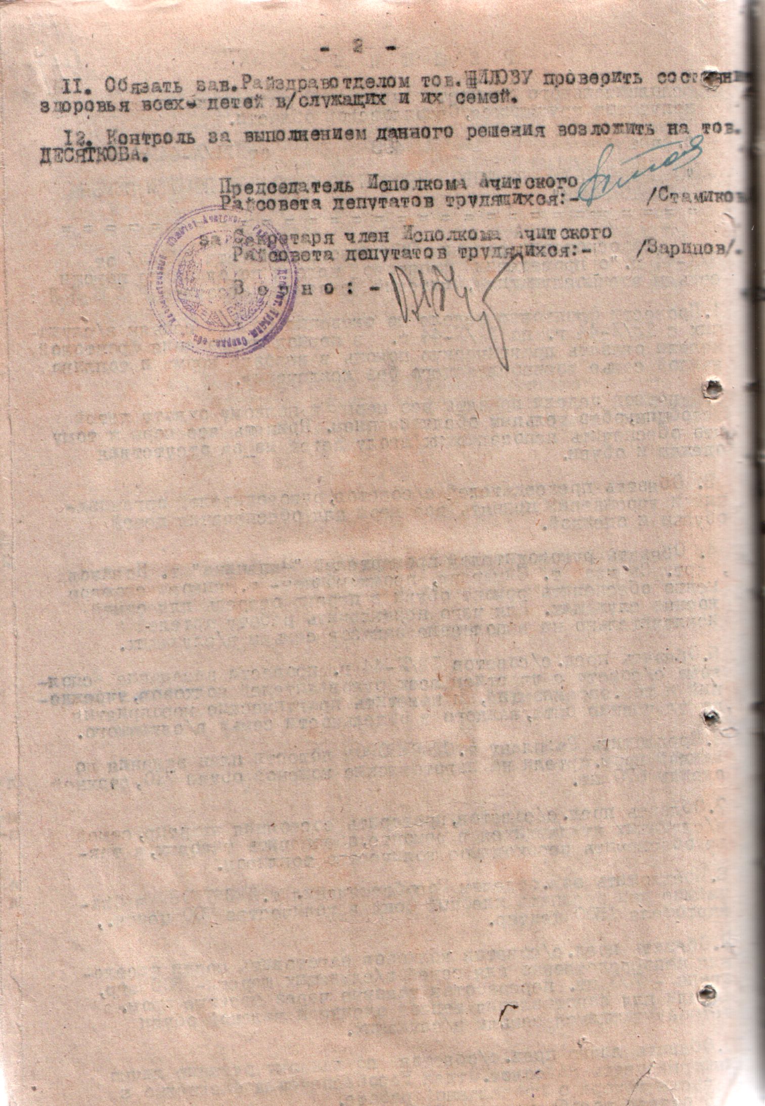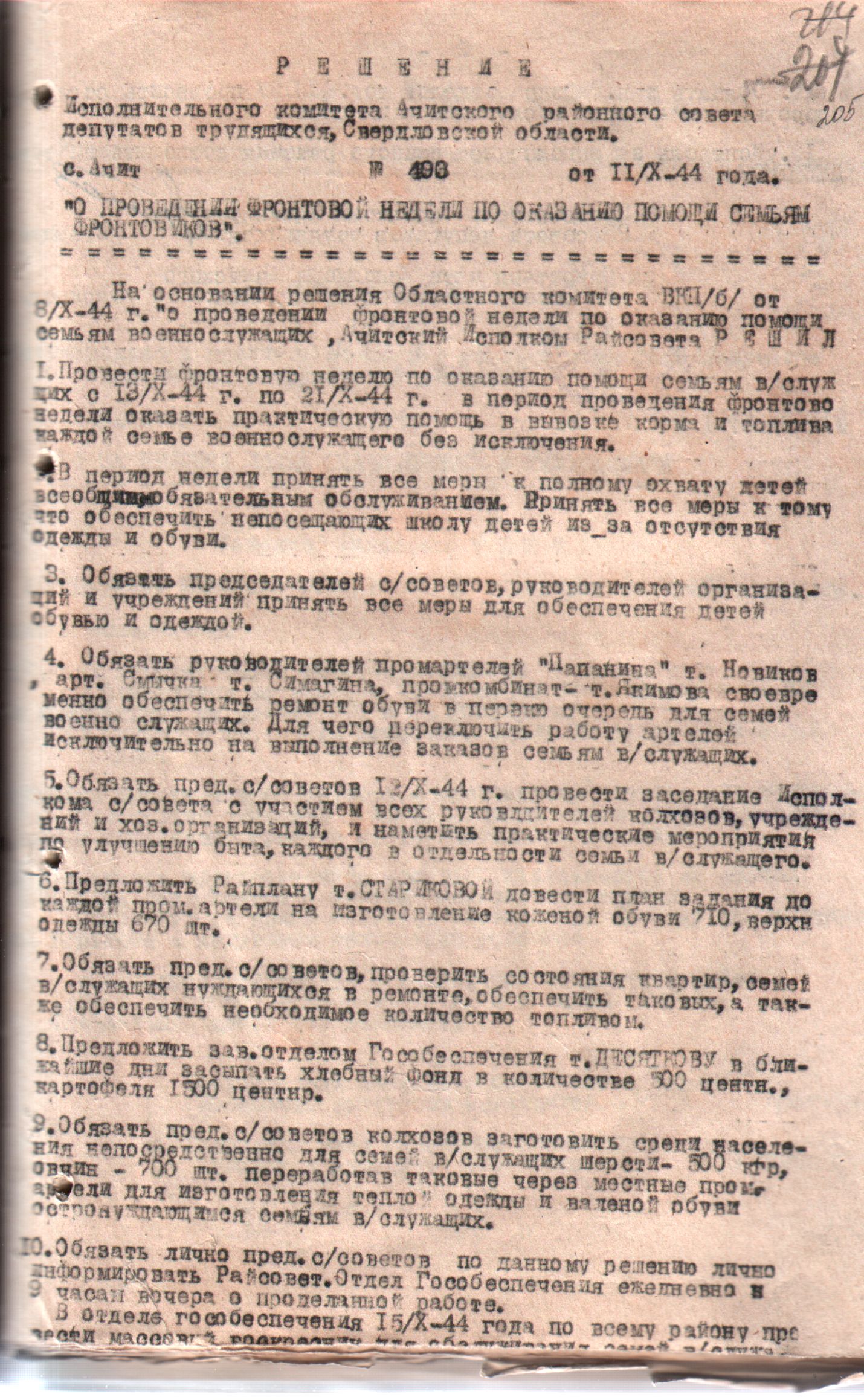 Решение Исполнительного комитета Ачитского районного Совета депутатов трудящихся Свердловской области от 02 октября 1944 года «О проведении фронтовой недели по оказанию помощи семьям фронтовиков».